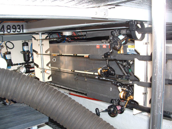 Fishing Rod RacksWhere to store the fishing rods? Well, when we're not cruising or relaxing, we're out fishing. The problem is rod storage. keeping them on the bridge under the seats works but it isn't very convenient and its gets messy when there are too many of them. On the single engined, 400 Trawler, there is some very handy space along the starboard fuel tank, that works great for hanging some fishing rods. There are two stantions, supporting the cabin floor, that make great place to put up som rod holders. I cut two sets of 4 rod holders, and fastened them back to back on each side of the stantions with hose clamps. |